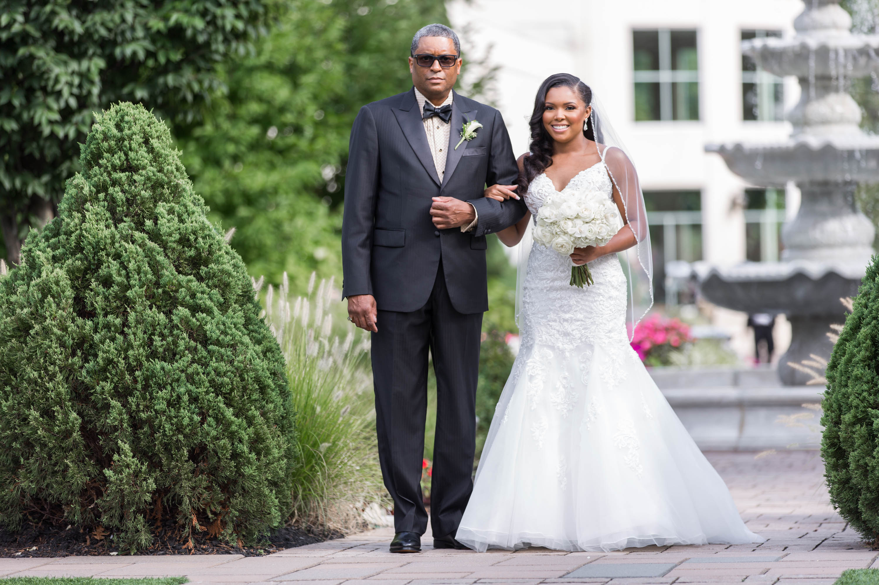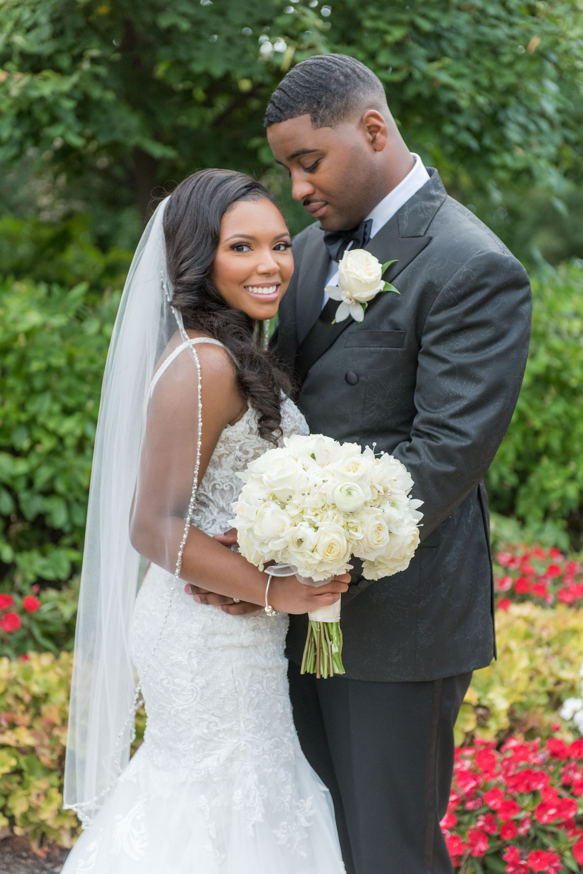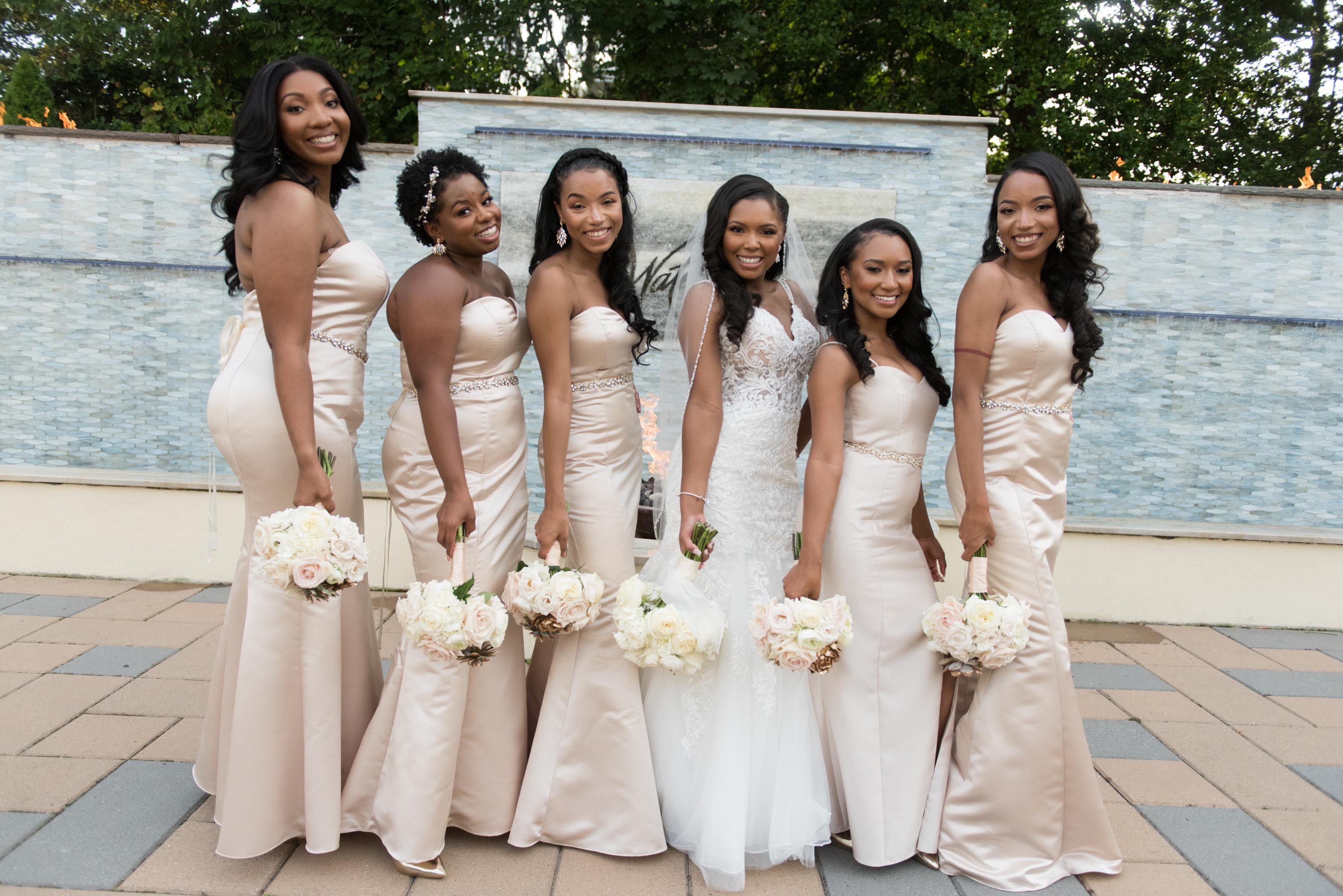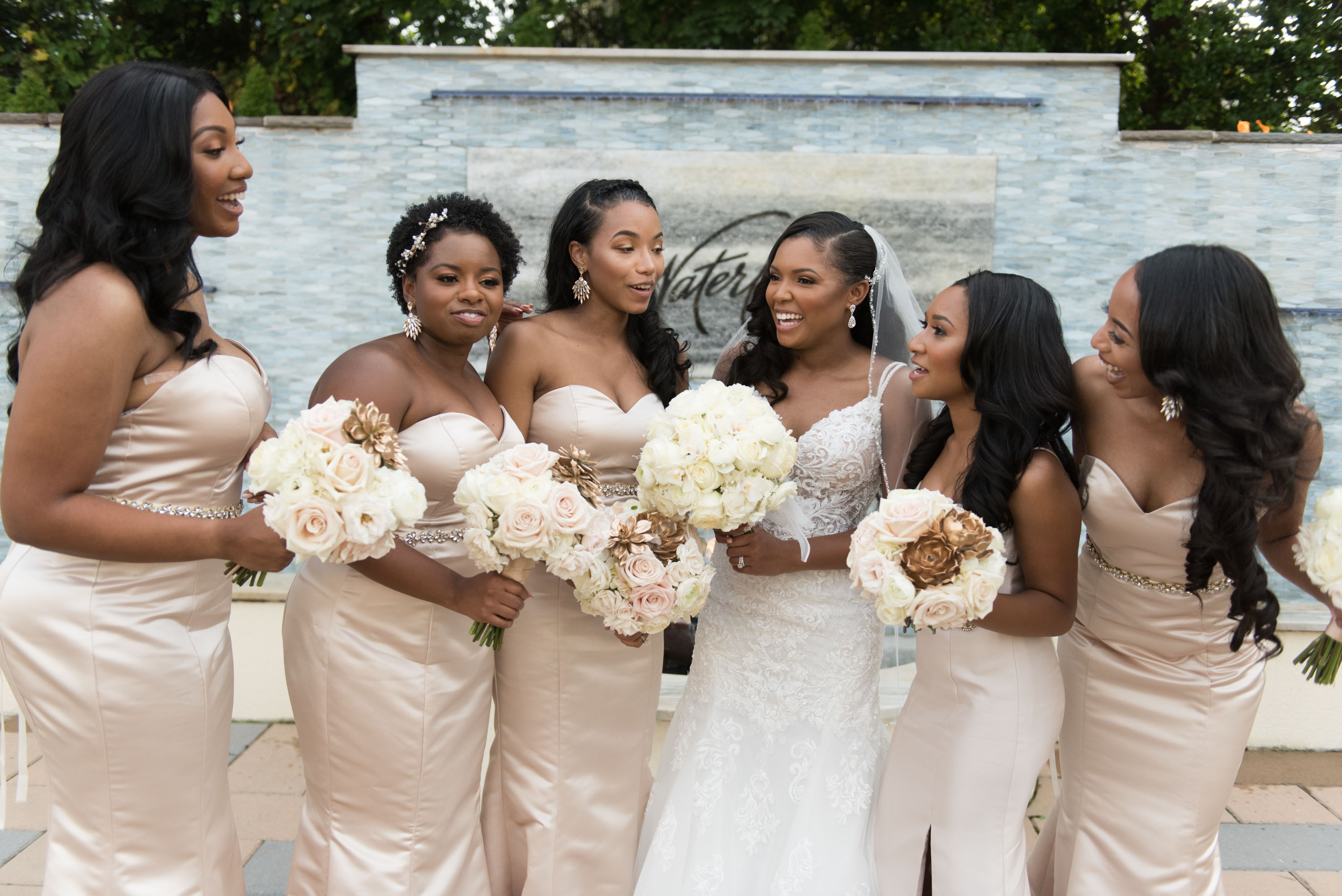 This past Sunday, Kabria and James tied the knot at the beautiful venue in Claymont, Delaware known as The Waterfall. This venue boasts two large ballrooms, incredible blown glass chandeliers, elegant decor, and hosts a large outdoor garden area with fire and flaming waterfalls, floral gardens and an outdoor ceremony area. The words “grand” and “decandant” come to mind. Its that perfect location for those who wish to have the option of stunning indoor and outdoor photos. The best of both worlds! But the highlight of the day was, without doubt, Kabria! The combination of her room-brightening smile, sweet disposition, and the breath-taking trumpet-styled wedding gown she wore lit up the room. You couldn’t help but notice the perfect marriage (pun intended!) of sophistication and down-to-earthness this couple, their family and friends, and decor and venue were. Simply stunning!