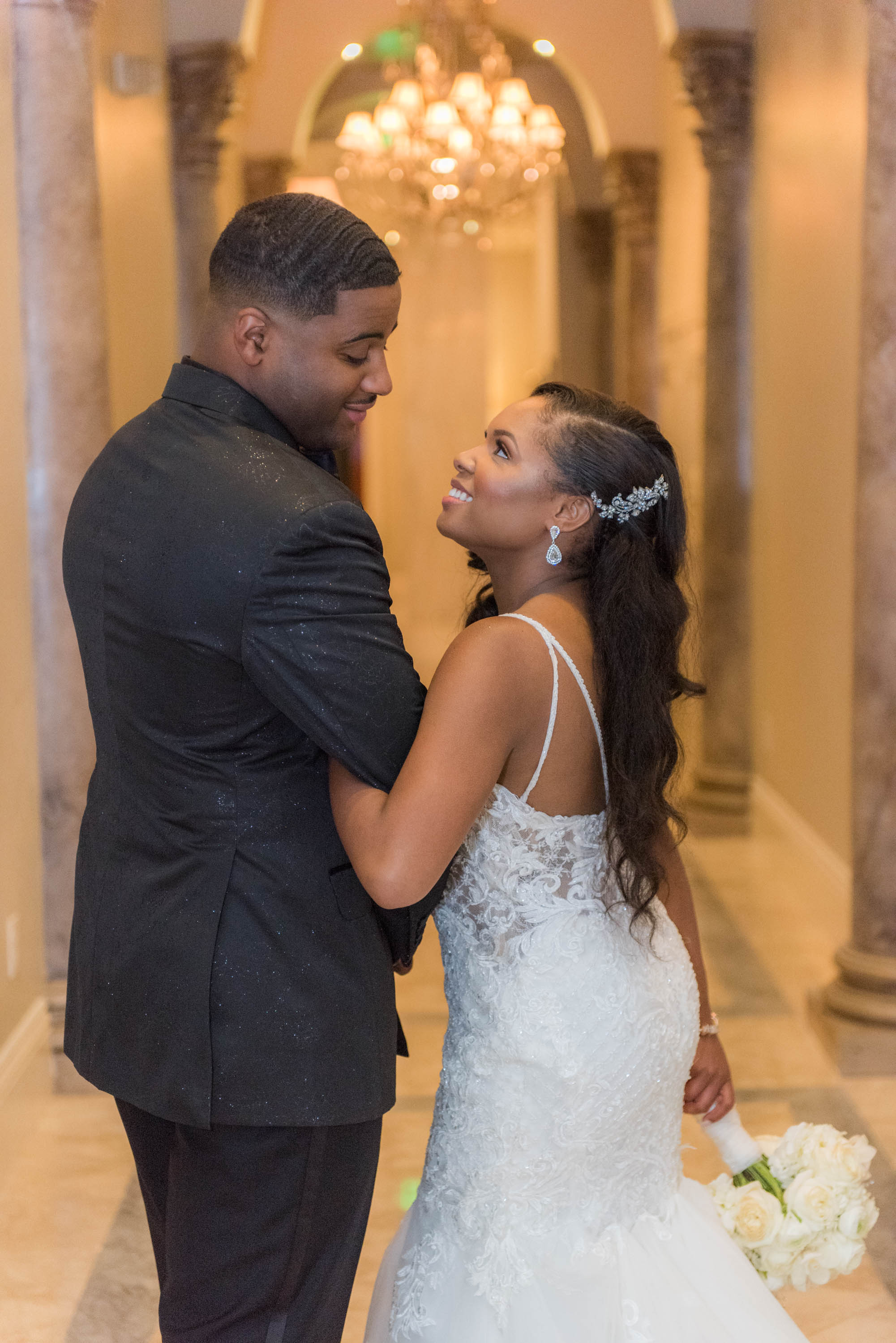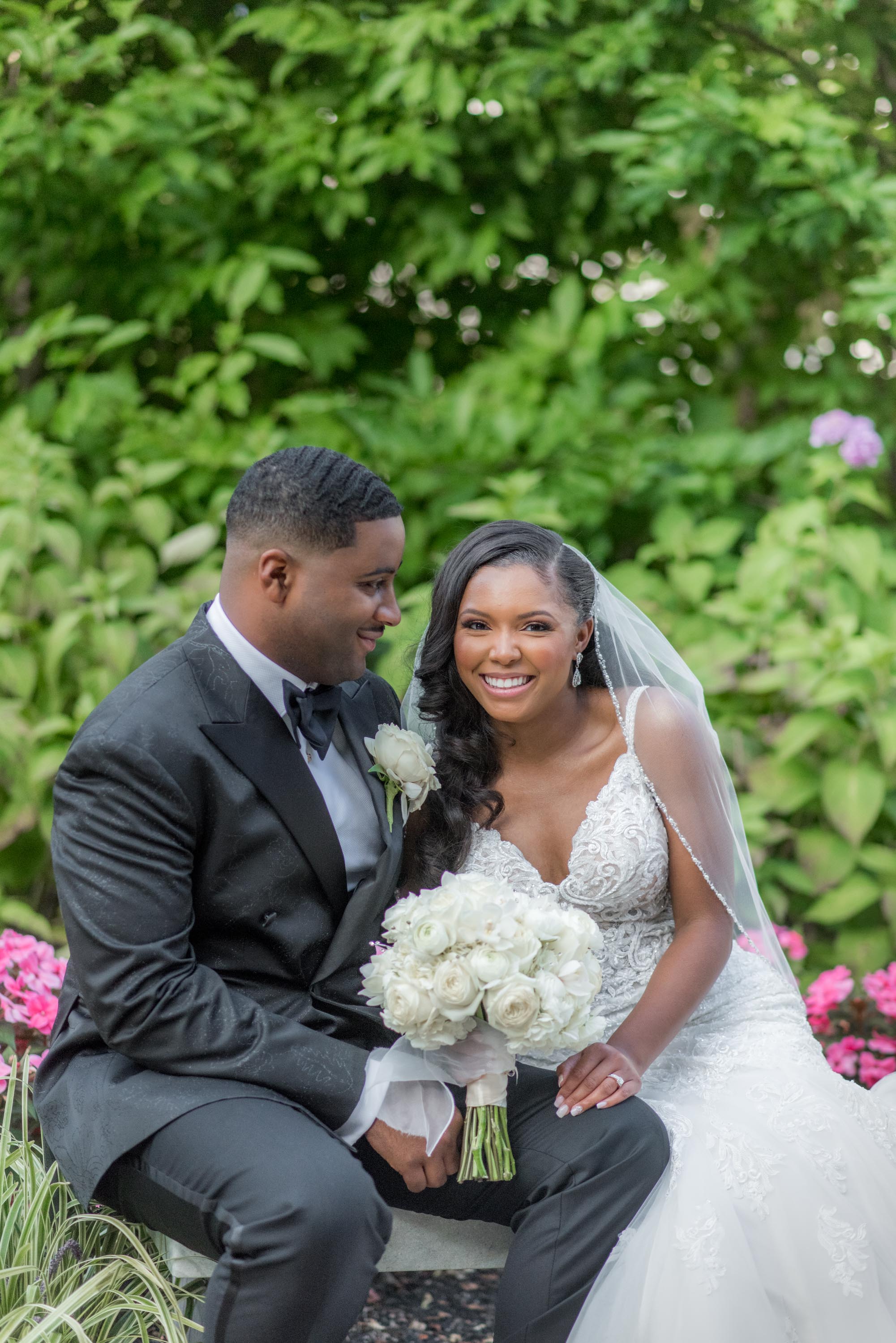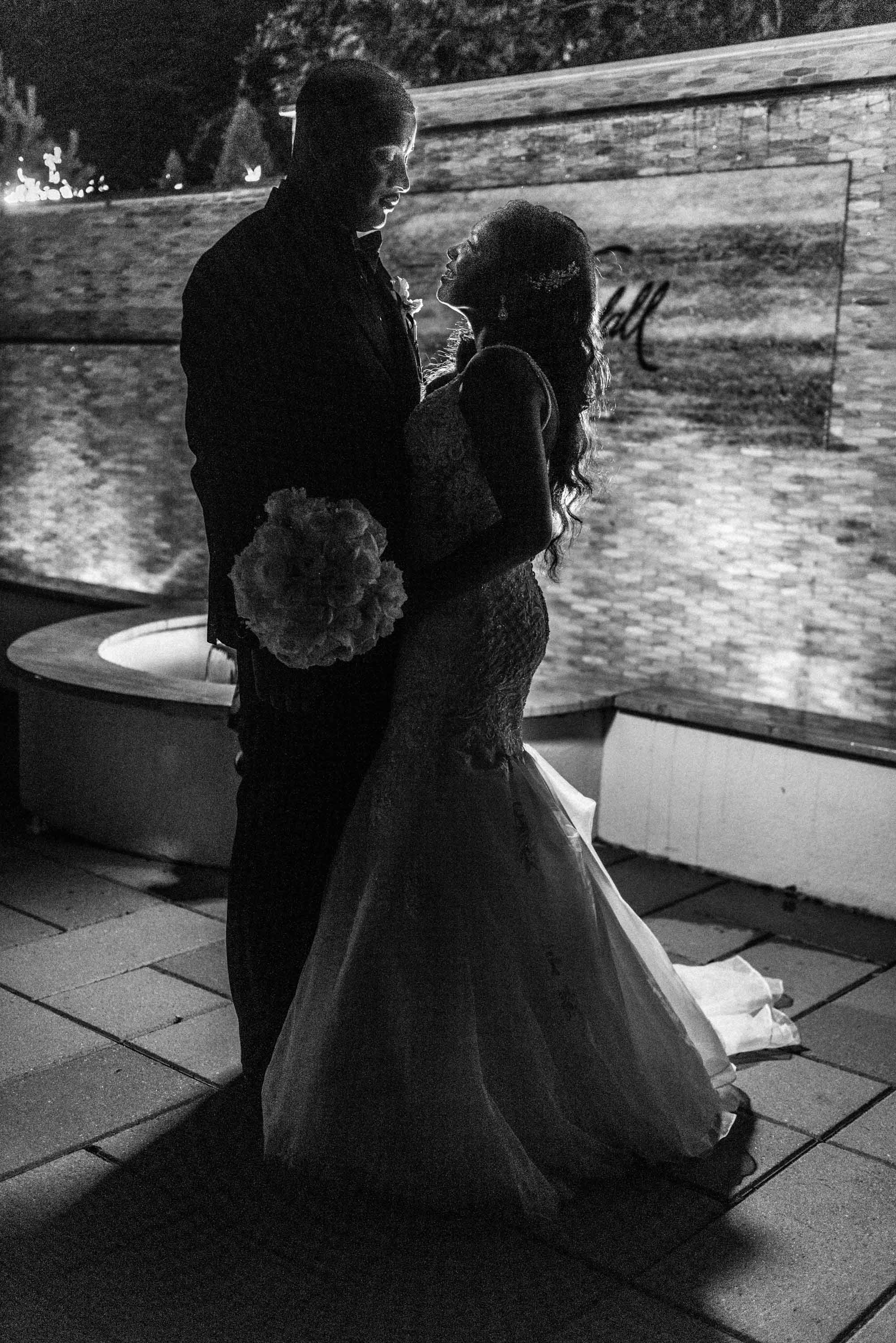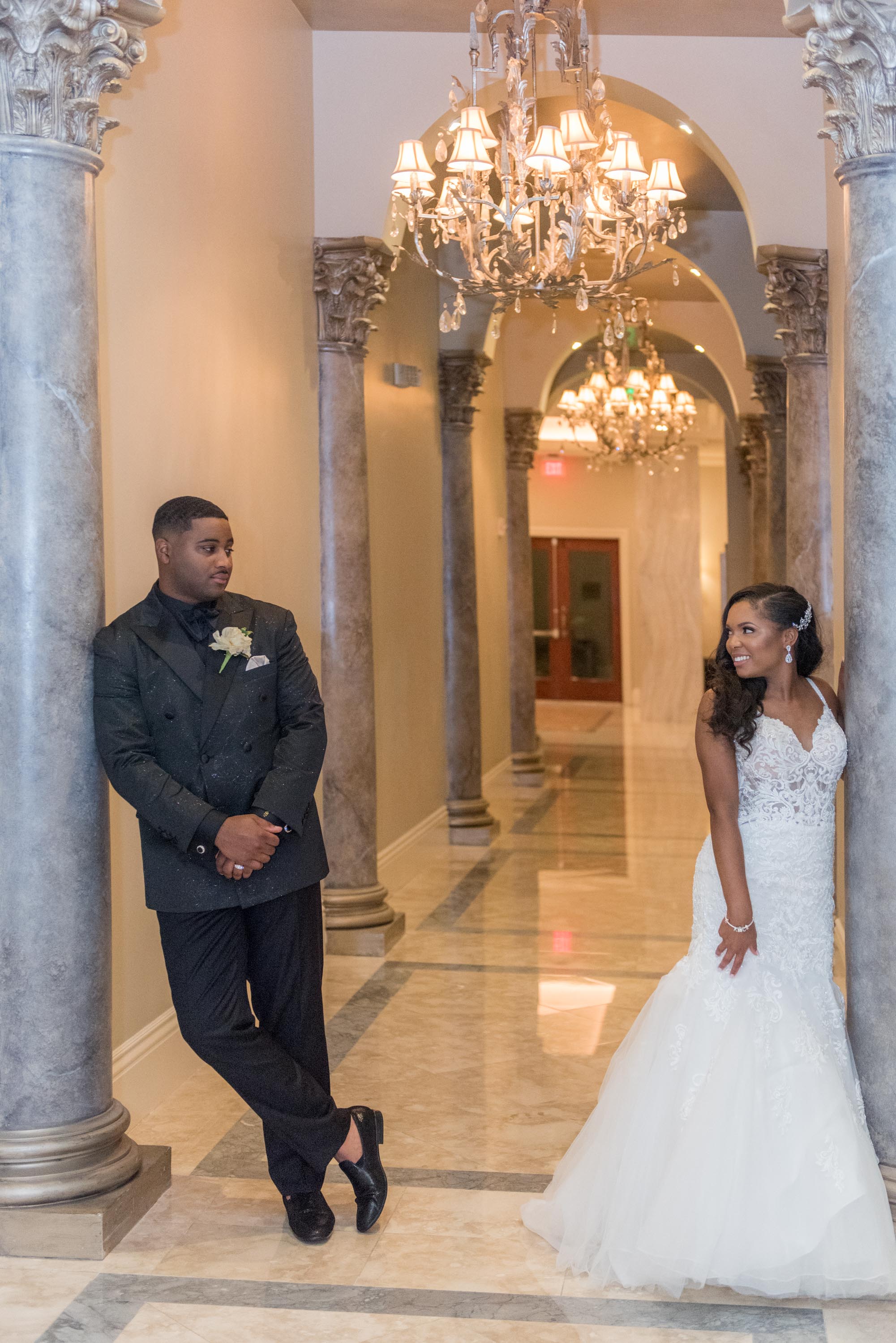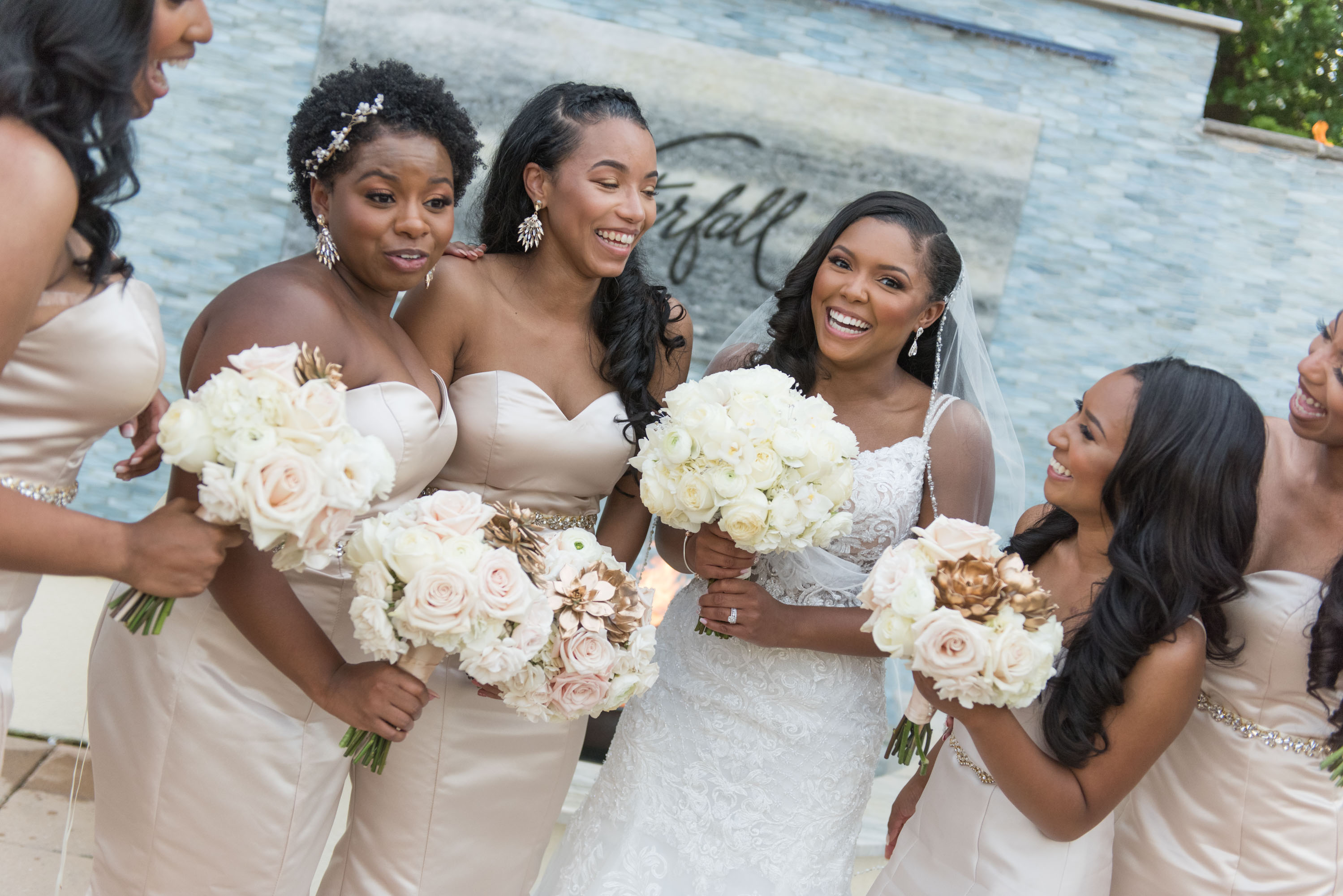 This past Sunday, Kabria and James tied the knot at the beautiful venue in Claymont, Delaware known as The Waterfall. This venue boasts two large ballrooms, incredible blown glass chandeliers, elegant decor, and hosts a large outdoor garden area with fire and flaming waterfalls, floral gardens and an outdoor ceremony area. The words “grand” and “decandant” come to mind. Its that perfect location for those who wish to have the option of stunning indoor and outdoor photos. The best of both worlds! But the highlight of the day was, without doubt, Kabria! The combination of her room-brightening smile, sweet disposition, and the breath-taking trumpet-styled wedding gown she wore lit up the room. You couldn’t help but notice the perfect marriage (pun intended!) of sophistication and down-to-earthness this couple, their family and friends, and decor and venue were. Simply stunning!