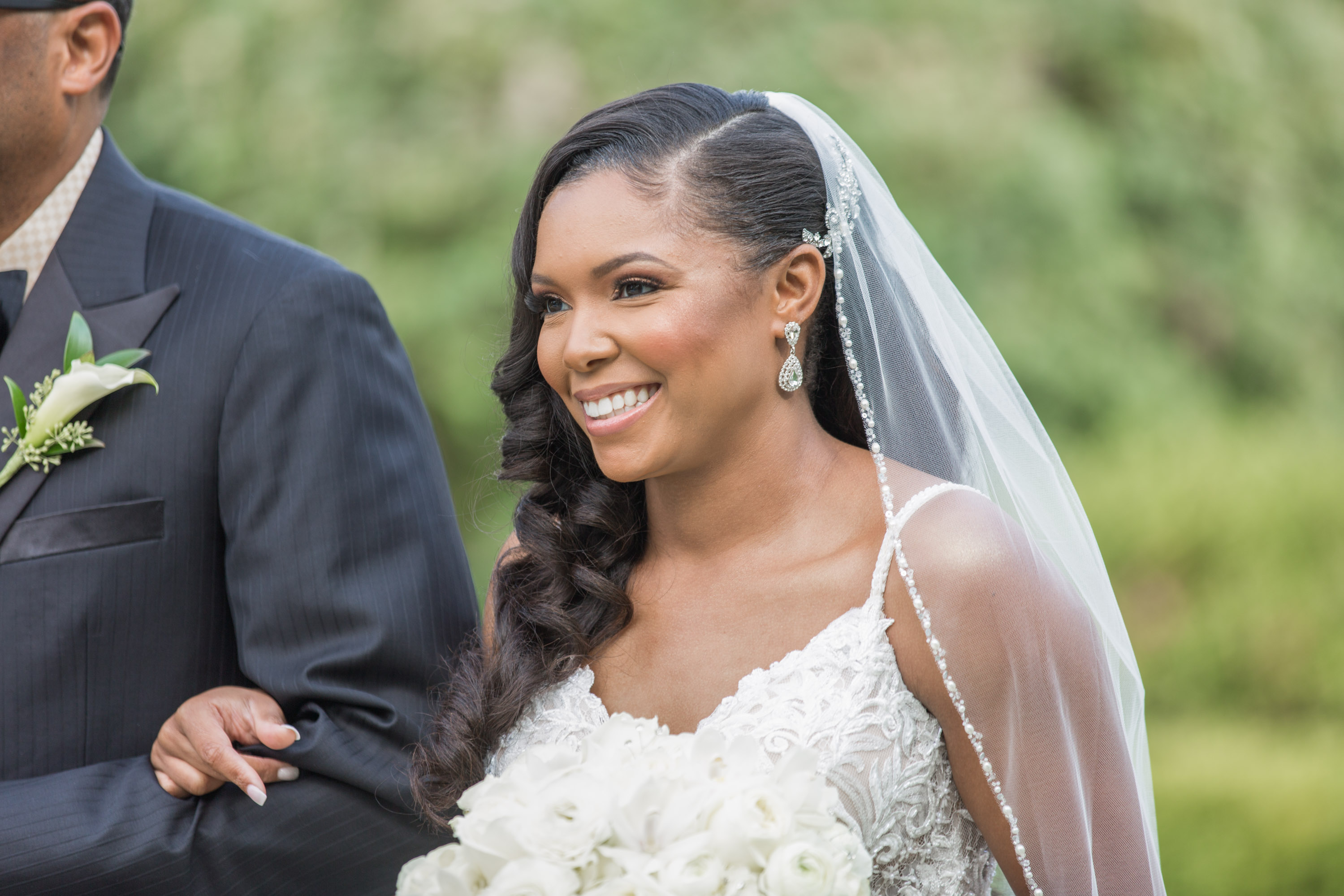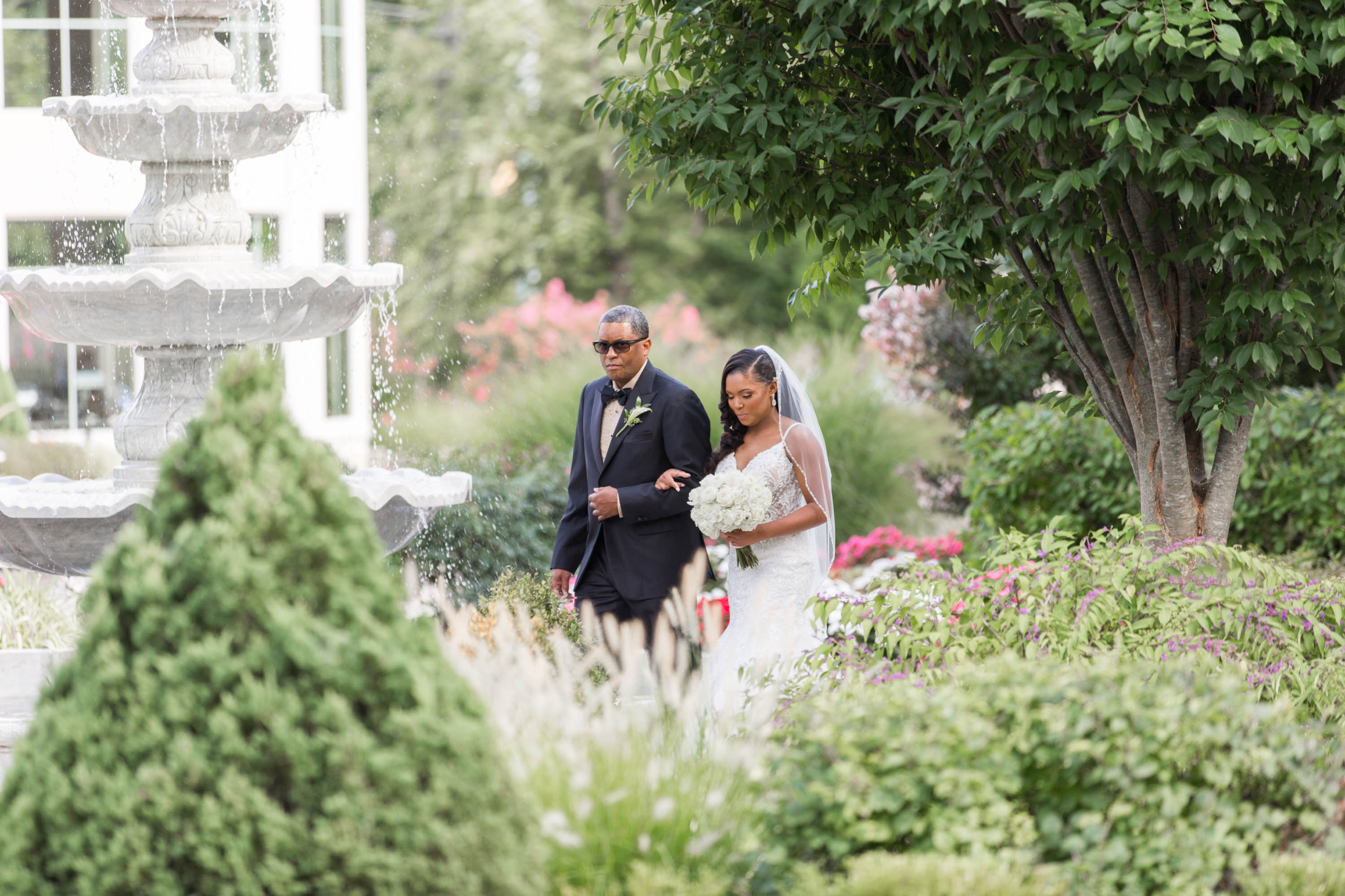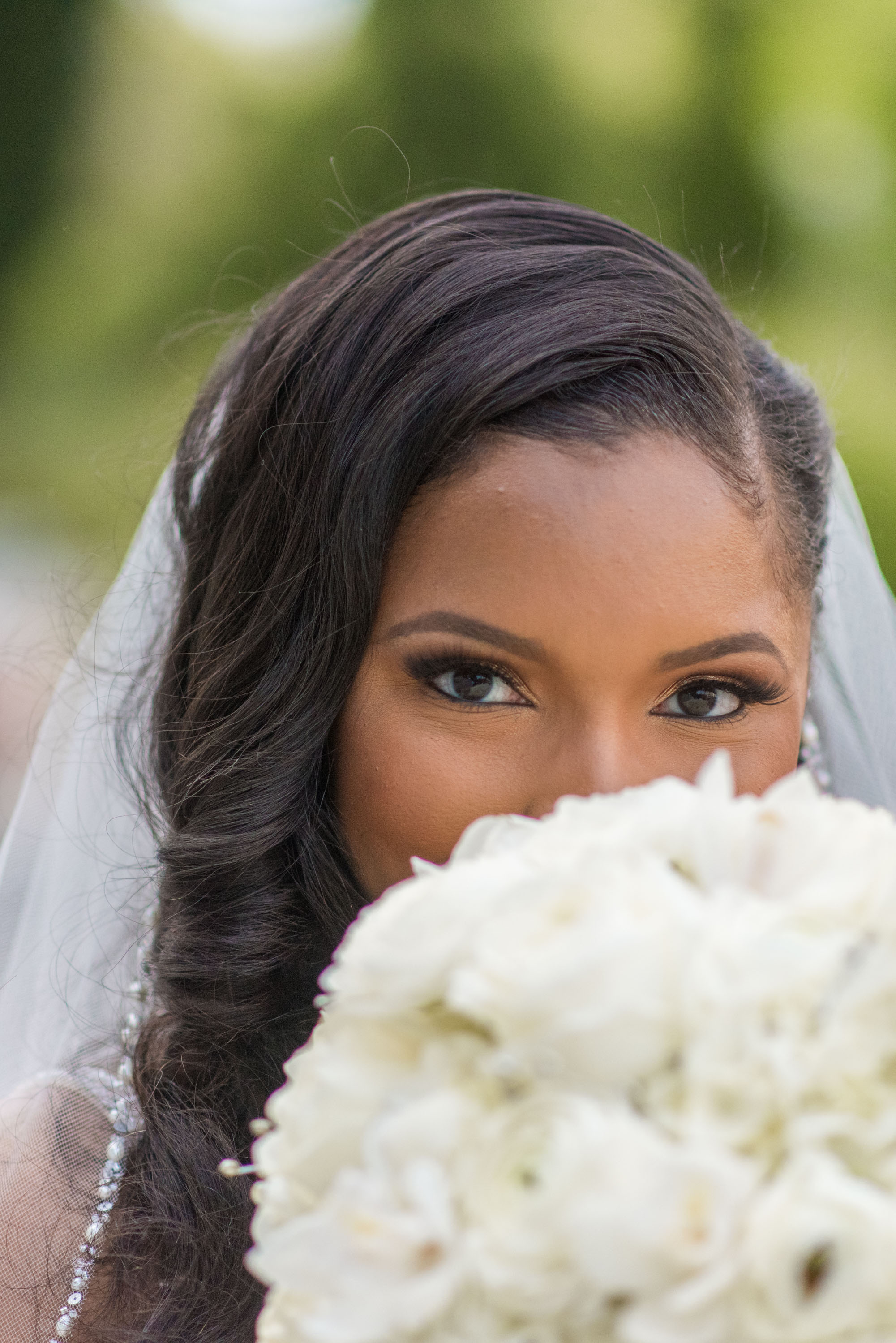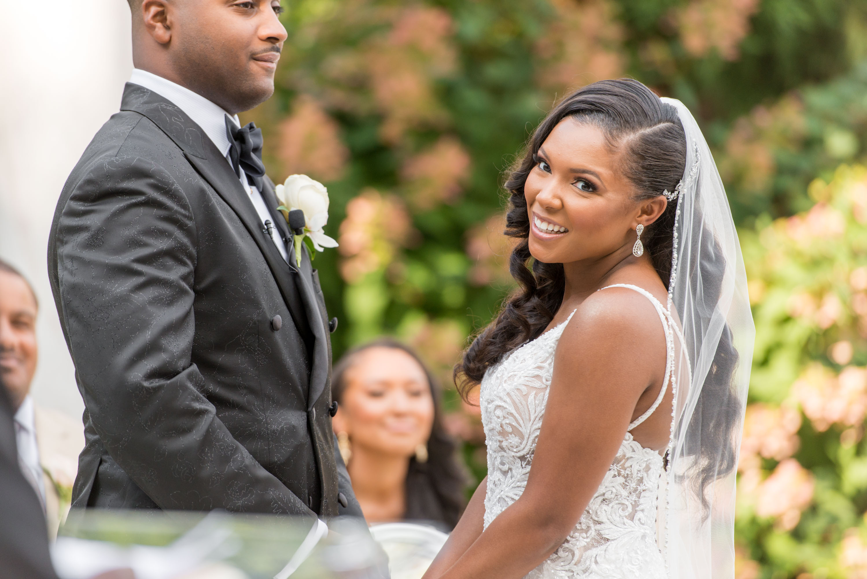 This past Sunday, Kabria and James tied the knot at the beautiful venue in Claymont, Delaware known as The Waterfall. This venue boasts two large ballrooms, incredible blown glass chandeliers, elegant decor, and hosts a large outdoor garden area with fire and flaming waterfalls, floral gardens and an outdoor ceremony area. The words “grand” and “decandant” come to mind. Its that perfect location for those who wish to have the option of stunning indoor and outdoor photos. The best of both worlds! But the highlight of the day was, without doubt, Kabria! The combination of her room-brightening smile, sweet disposition, and the breath-taking trumpet-styled wedding gown she wore lit up the room. You couldn’t help but notice the perfect marriage (pun intended!) of sophistication and down-to-earthness this couple, their family and friends, and decor and venue were. Simply stunning!