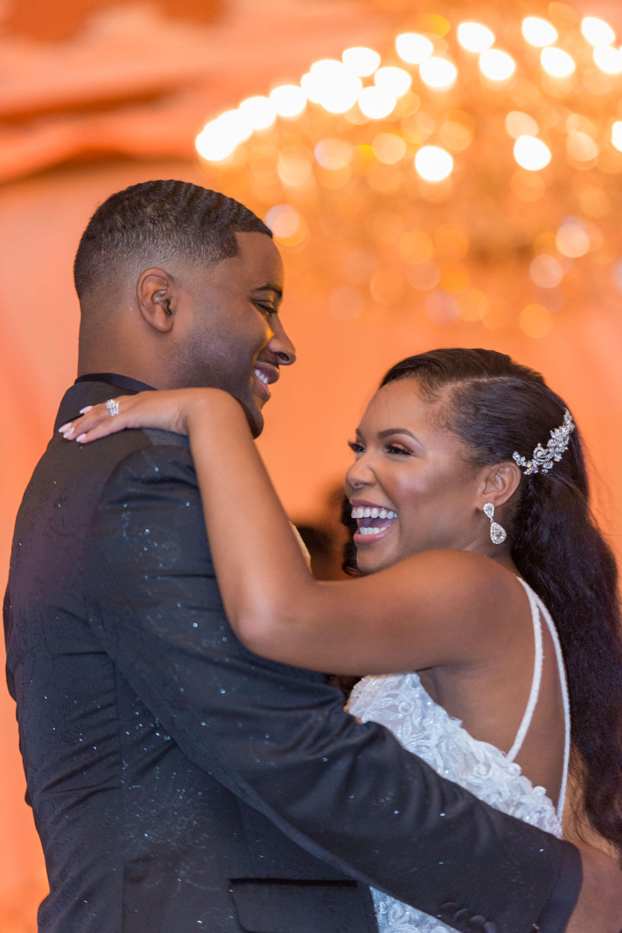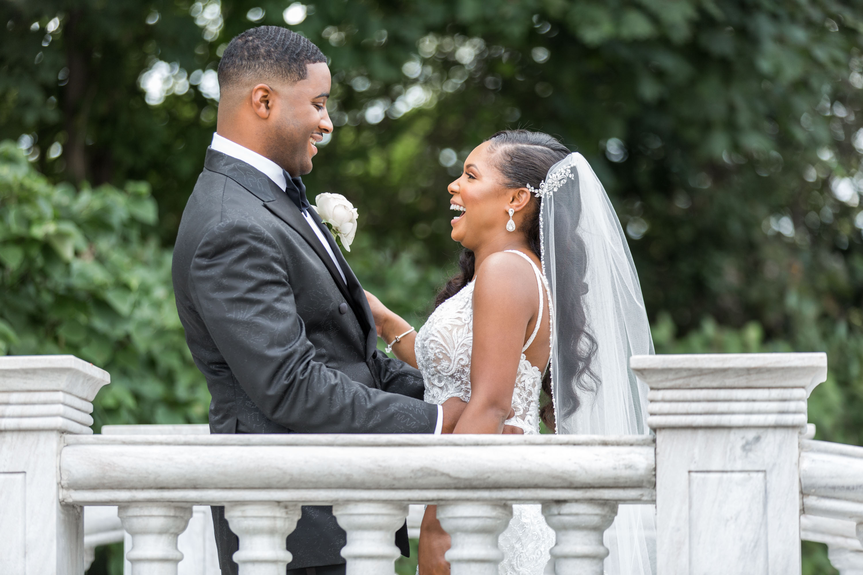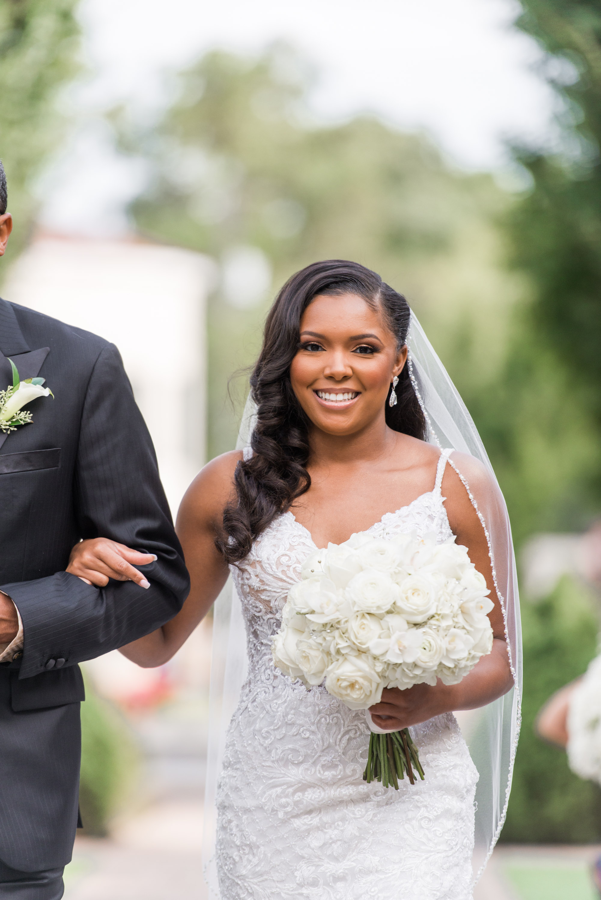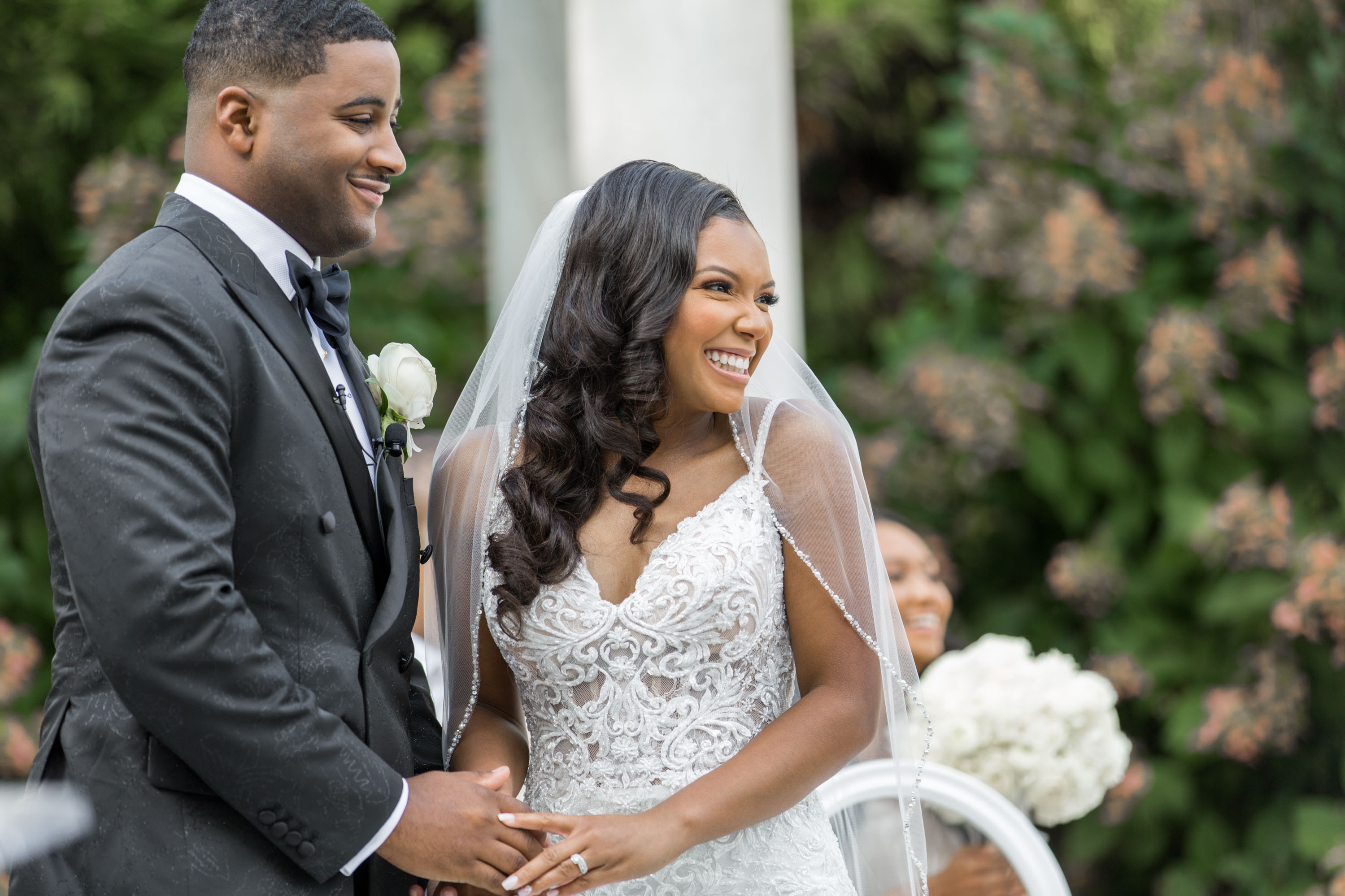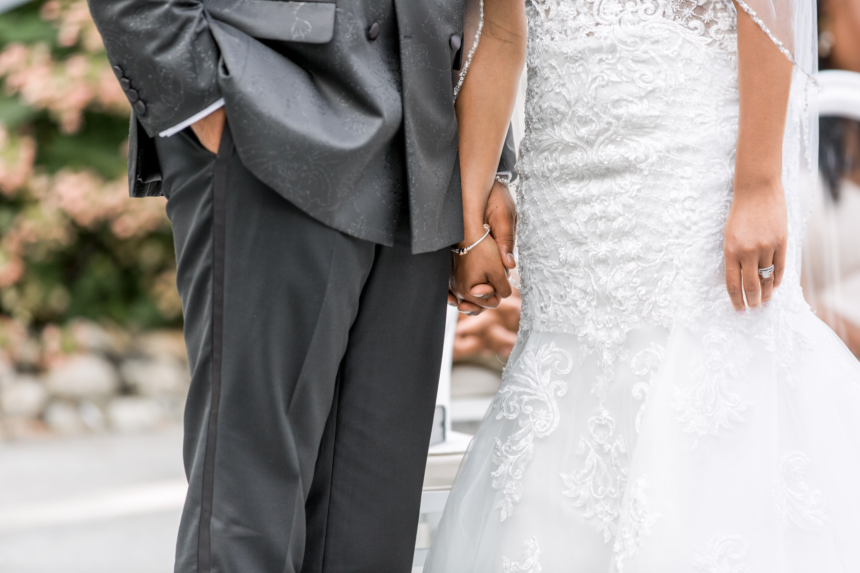 This past Sunday, Kabria and James tied the knot at the beautiful venue in Claymont, Delaware known as The Waterfall. This venue boasts two large ballrooms, incredible blown glass chandeliers, elegant decor, and hosts a large outdoor garden area with fire and flaming waterfalls, floral gardens and an outdoor ceremony area. The words “grand” and “decandant” come to mind. Its that perfect location for those who wish to have the option of stunning indoor and outdoor photos. The best of both worlds! But the highlight of the day was, without doubt, Kabria! The combination of her room-brightening smile, sweet disposition, and the breath-taking trumpet-styled wedding gown she wore lit up the room. You couldn’t help but notice the perfect marriage (pun intended!) of sophistication and down-to-earthness this couple, their family and friends, and decor and venue were. Simply stunning!